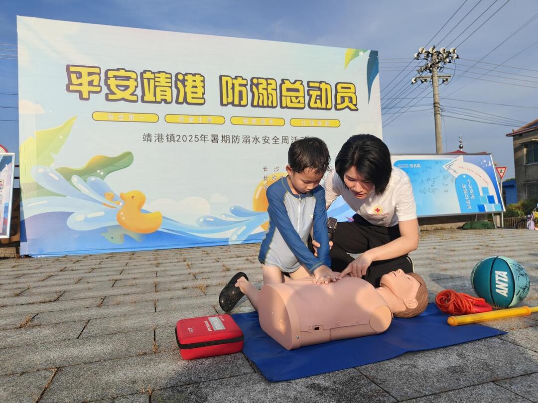 区红十字救护师资带来“3+3”教学(风险识别、自救技巧、施救原则3大模块,搭配情景模拟、实操体验、竞技游戏3种形式),18米直径充气池内,孩子们分组完成“浮具制作挑战赛”,用救生绳、竹竿等道具演练求生技能;来自靖港镇社工站、卫生院、复胜村的10余名志愿者,每日在签到台、教学区、应急点轮岗值守,保障“双签到”制度落地和现场安全;复胜村“三长”充分发挥人熟、地熟、情况熟的优势,提前入户宣传活动信息,协助家长完成电话报名,在课程中担任“安全观察员”,及时提醒儿童规避风险。