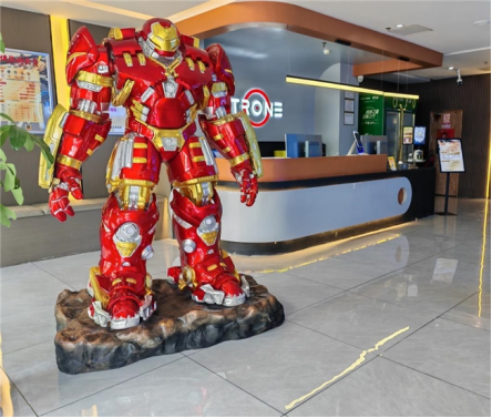踏入酒店大堂,极具科技感的光影矩阵便扑面而来。大堂中央,新增巨型装甲模型正以战斗姿态伫立,锃亮的合金装甲折射着冷光,猩红的光学传感器里藏着未熄的战意。休息区的钢铁侠,它不是冰冷的摆件,而是从银幕中破壁而来的战友。巨型LED电竞屏实时播放热门赛事,瞬间点燃你的战斗热血。