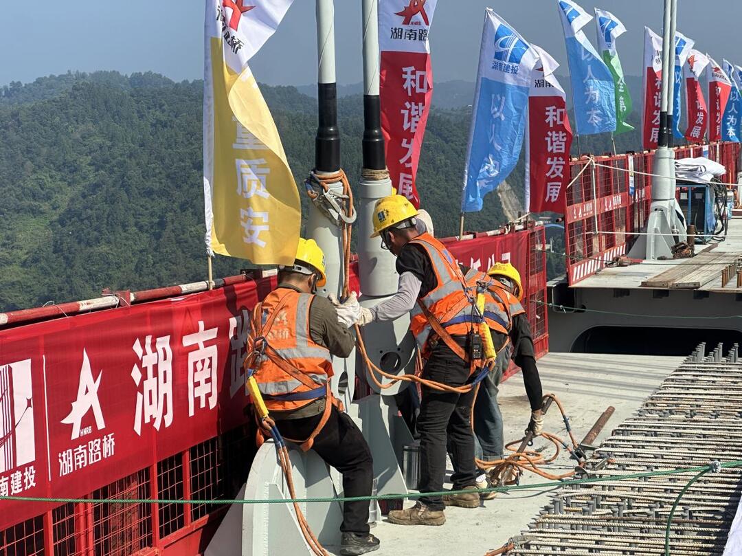 施工现场,建设者的欢呼声与沅水涛声汇成一片。153.5米高的南索塔与124.5米的北索塔隔江矗立,8300余吨钢梁组成的67个节段完成最后拼接,标志着全桥主体结构贯通。大桥采用北斗定位提升吊装精度,创新将物联网技术融入到钢桁梁吊装中,整合设备吊装资源,减少人工高空作业面,在提高施工效率的同时促进安全生产。