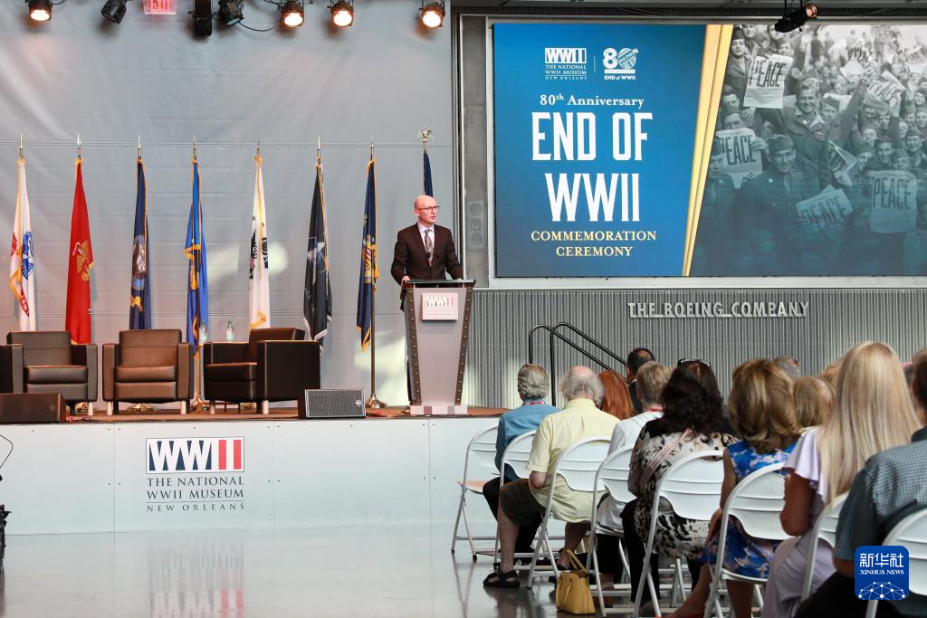 8月14日,在美国路易斯安那州新奥尔良市,军事历史学家约翰·库拉托拉在二战结束80周年纪念仪式上发言。新华社发(魏兰摄)