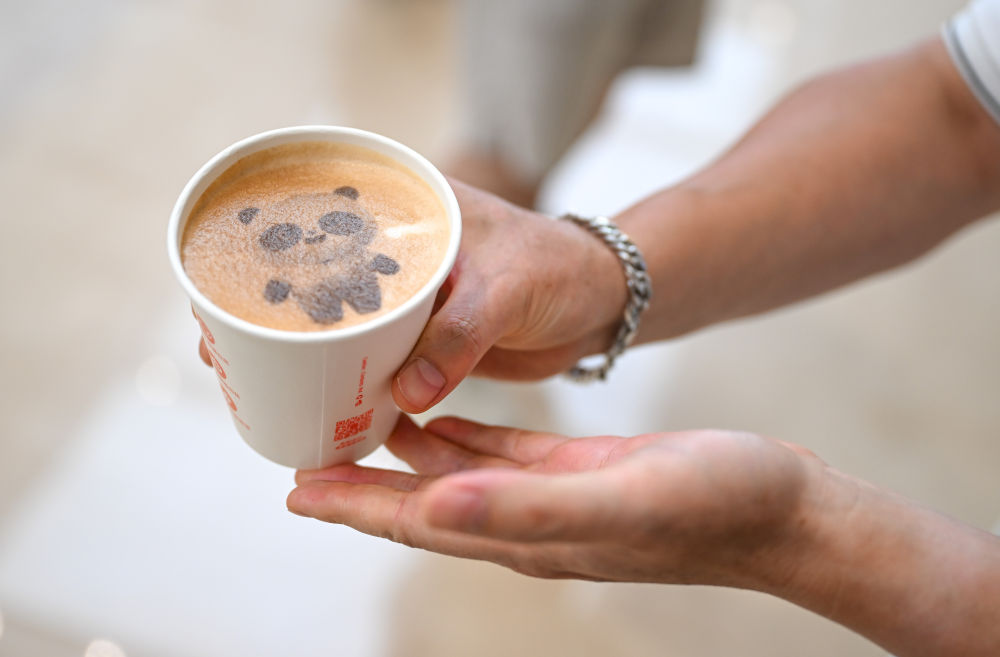 8月4日,一名媒体记者在成都世运会主媒体中心展示由咖啡机器人制作的带有吉祥物“蜀宝”图案的饮品。新华社记者 贝赫 摄