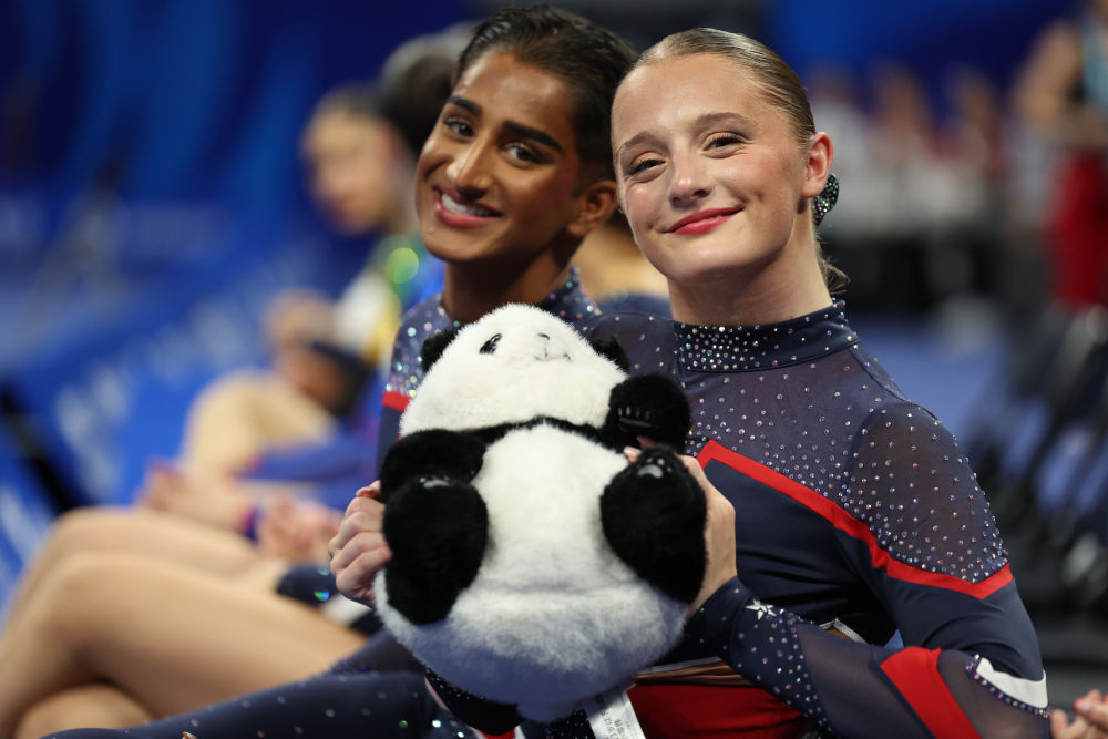 8月16日,英国啦啦操组合康/斯温纳顿展示熊猫玩偶。 新华社记者 梁旭 摄