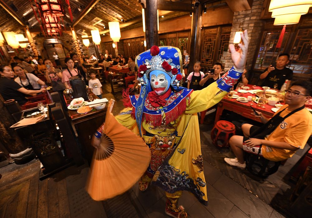 图为食客在四川省成都市宽窄巷子景区内的一家火锅店观看“变脸”表演。新华社记者 刘坤 摄
