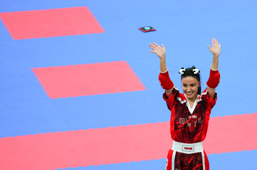 成都世运会自由搏击女子半接触50公斤级半决赛赛场,土耳其选手克伦奇赢下比赛后,摘下护具,从包里拿出一个熊猫发卡,戴在头上,露出甜美的笑容,现场响起热烈的掌声。